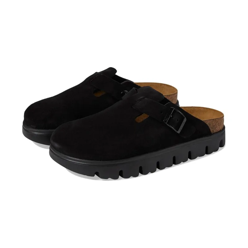 - The ultimate comfort wearing Birkenstock® Papillio Boston Chunky Clog! Experience unmatched support with a suede upper and adjustable strap, while the contoured cork-latex footbed molds to your foot for custom support. Breathe easy with leather linings and enjoy the natural grip of the raised toe bar. Stay cozy with a suede footbed lining and stride confidently on the lightweight, chunky EVA outsole. The adjustable buckle ensures a perfect fit every time, making these clogs your go-to for both style and comfort.