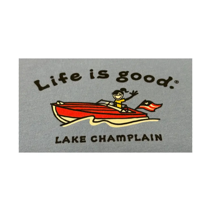 Set sail in style with Life is Good’s exclusive Lake Champlain Cruiser Tee! This playful cornflower blue shirt features a boat design and is perfect for a day of cruising on the lake. Just add sunglasses and a smile for the ultimate summer look.